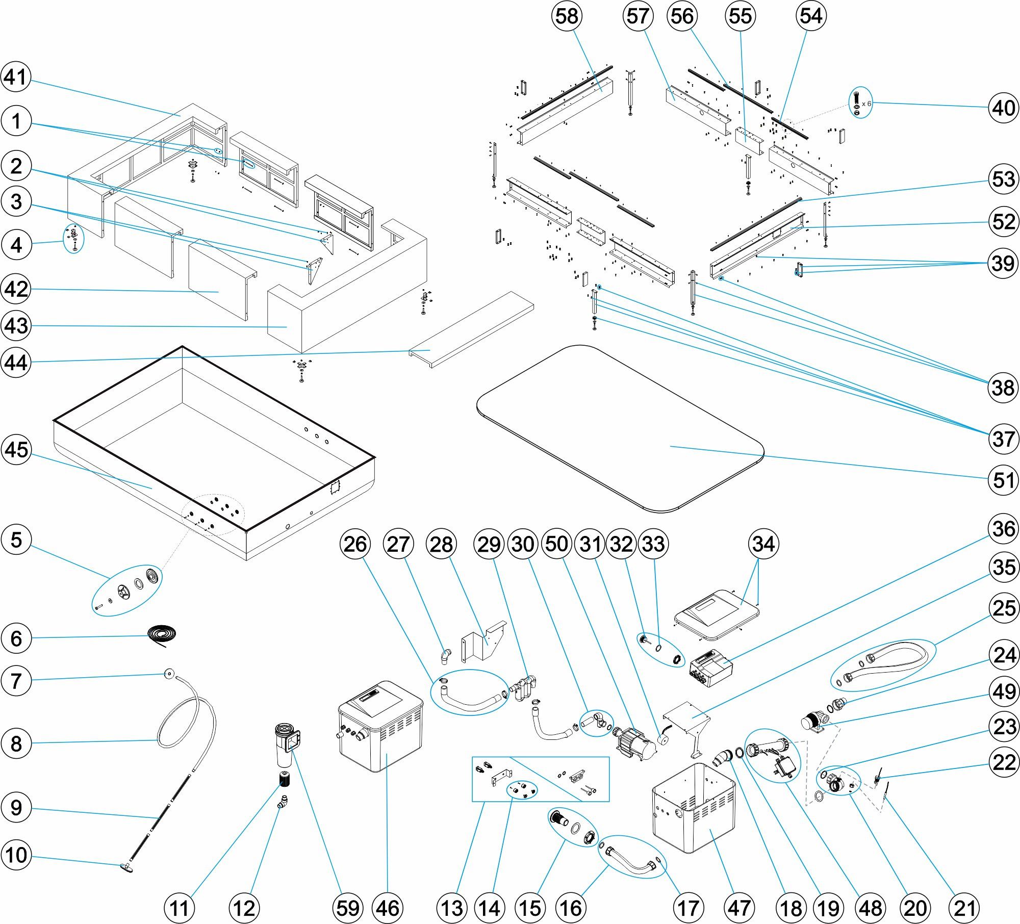 Liner branco, sistema de filtraçào 12 v, skimmer parede, foco LED, aquecedor, ventilador e painéis de fibra sintética.
