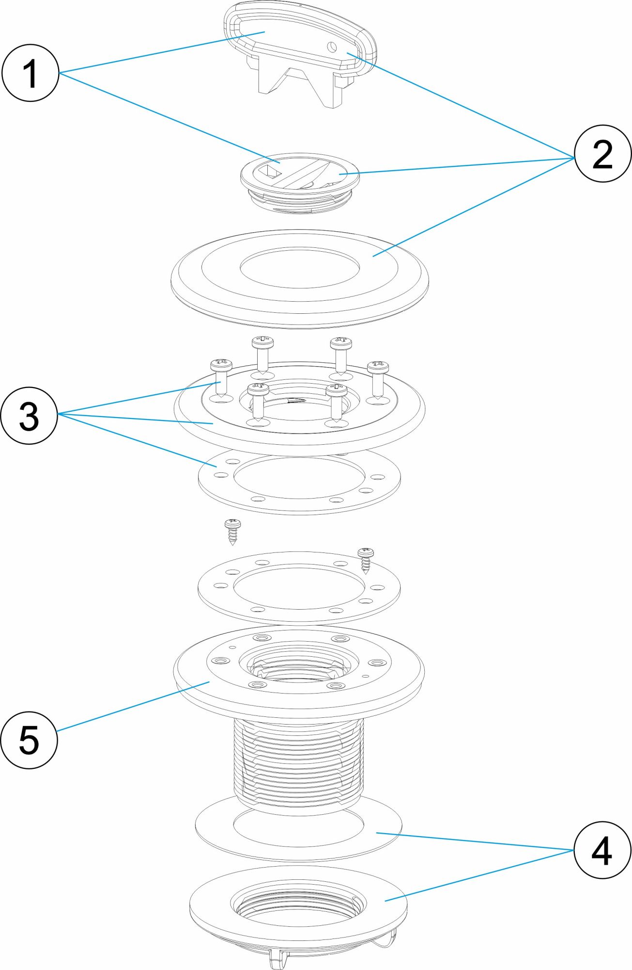 Rosca de 2” exterior, interior Ø 50 mm. De ABS branco. Inclui tampão roscado de 11/2", juntas e parafusos. Recomendado para instalação com conduta de parede 15663.