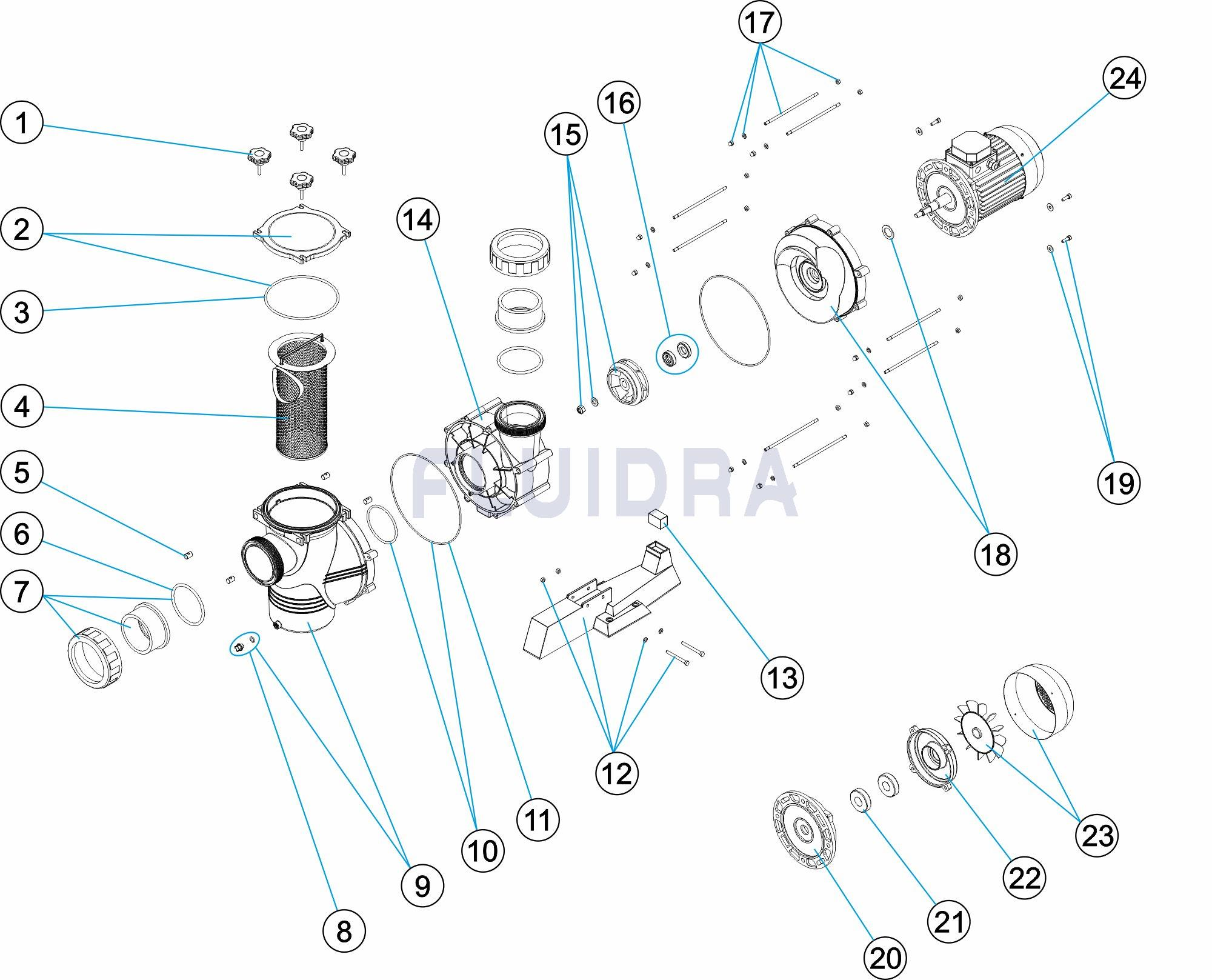 Eixo da bomba e cesto do pré-filtro em aço inoxidável.